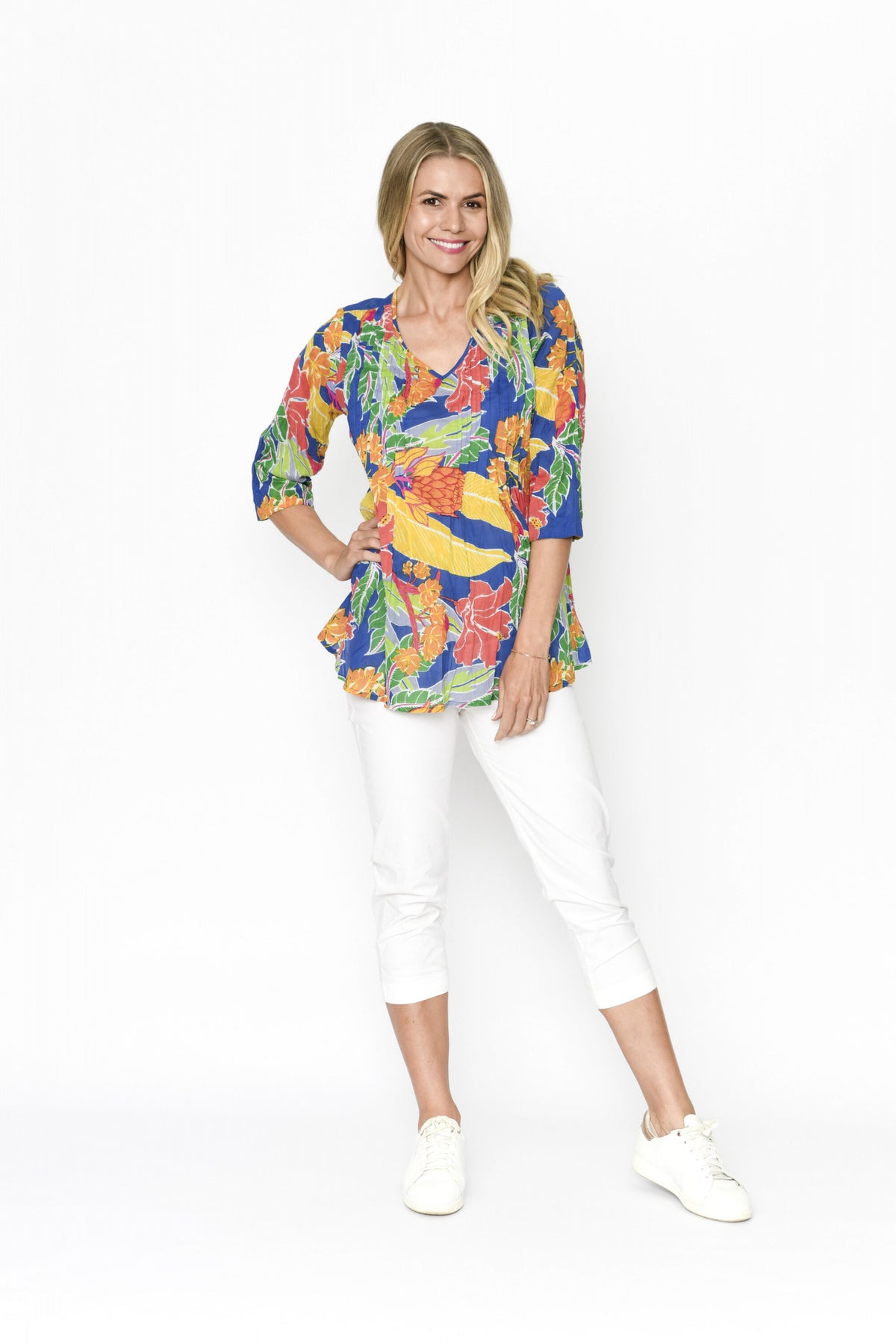 Our Tina V-neck pleated Top offers vibrant style and 100% cotton comfort. This top features a flattering V-neck, chic 3/4 sleeves, and subtle front pleating for a graceful flow. Adorned with a lively all-over print. It’s perfect and effortless casual wear