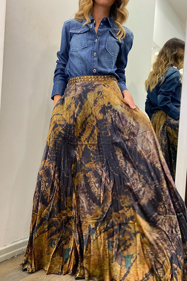 Women Autumn Retro Printed Elastic Waist Long Skirt