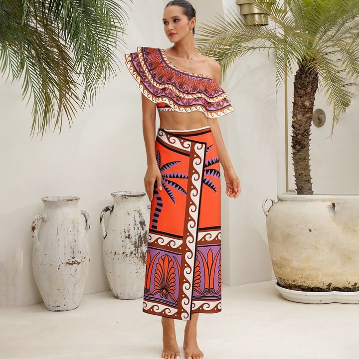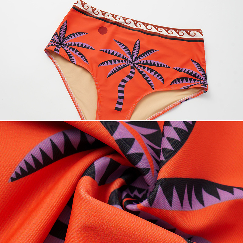 Shoulder Double Layer Flounced Printed Swimsuit Women High Waist Bikini